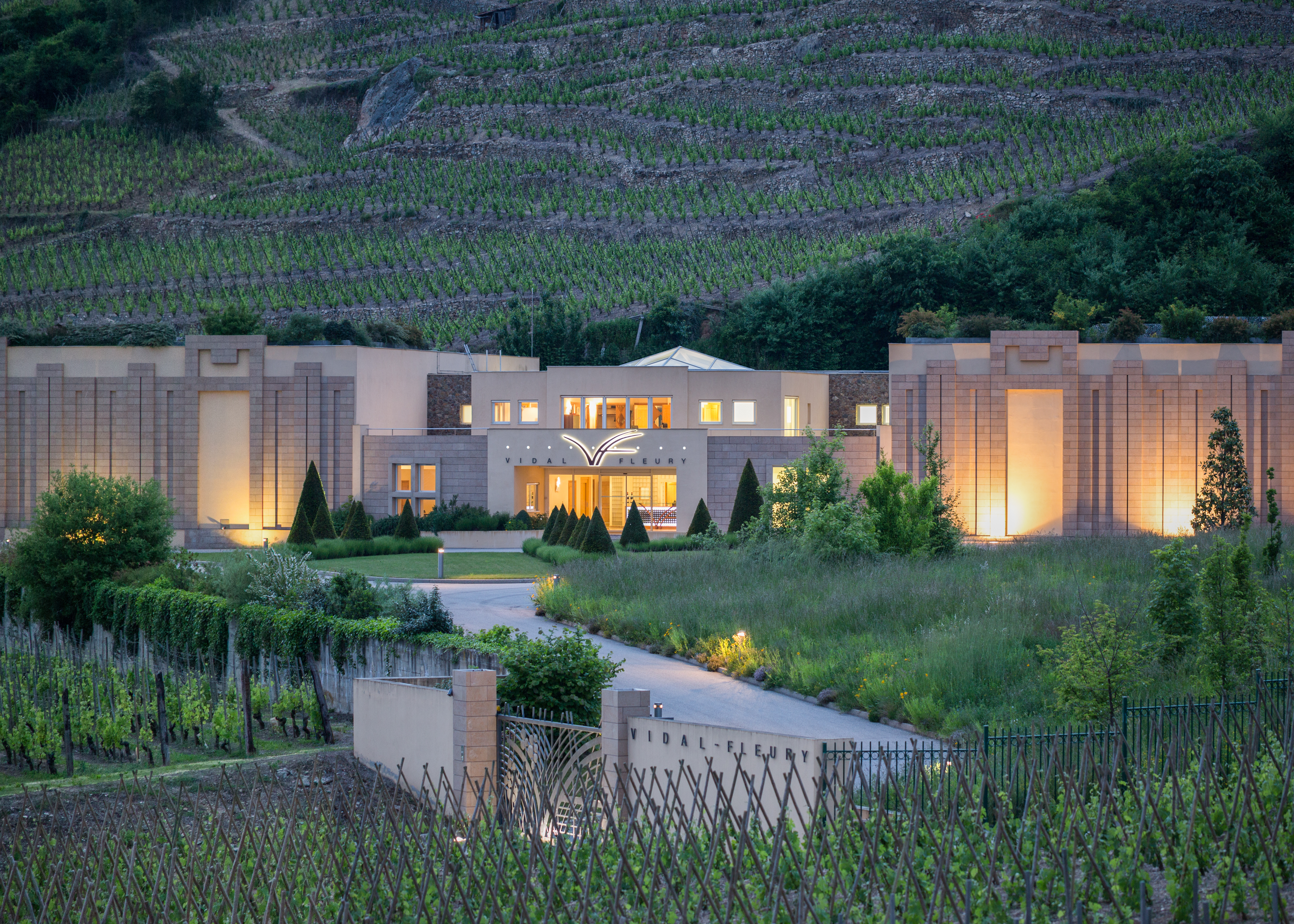 Côte-Rôtie, Cave Vidal-Fleury, éclairage au crépuscule.